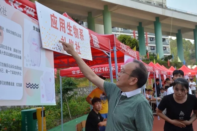 校长李滔在办公室主任黄峰和团委书记邓杨的陪同下出席活动,兴致盎然地观摩社团展示,并参与社服投票。每到一个展位,同学们都使尽“浑身解数”,争取校长宝贵的一票!